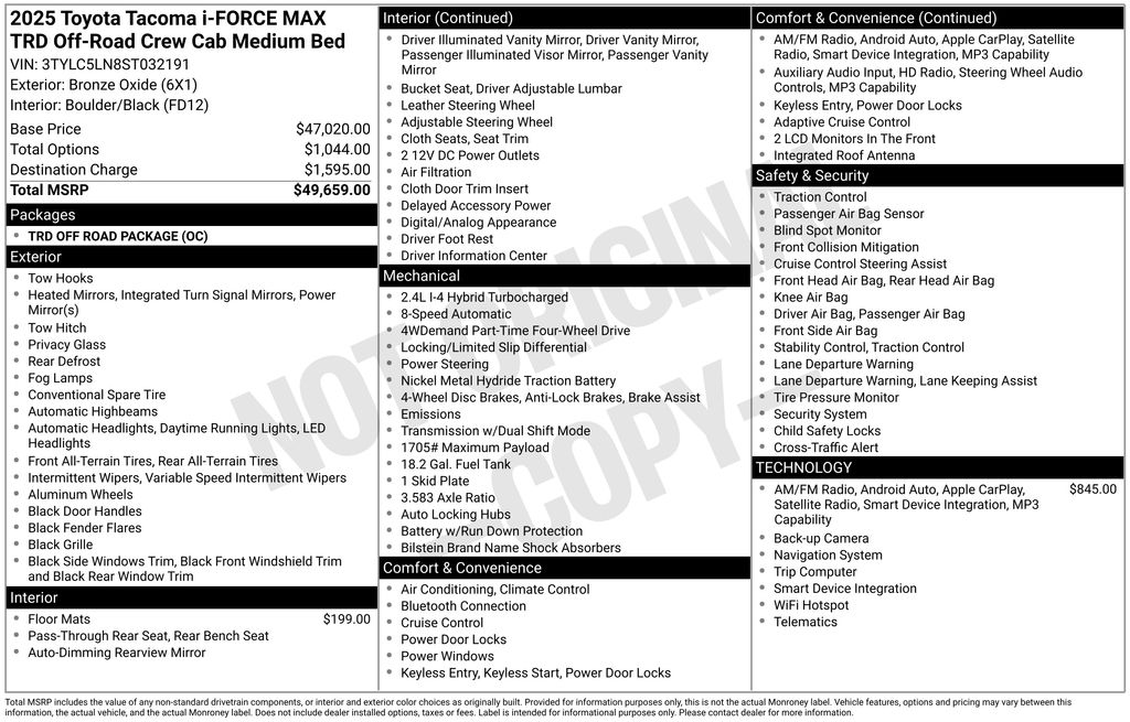 Beyond these impressive amenities, the 2025 Tacoma Hybrid TRD Off Road is packed with an array of advanced technologies and capabilities that will elevate your driving experience. Enjoy the convenience of Remote Keyless Entry, the added safety of Active Cruise Control and Electronic Stability Control, and the confidence of Traction Control and Heated Door Mirrors. The Illuminated Entry and Navigation System will ensure you're always connected and informed, while the ABS Brakes and Low Tire Pressure Warning will provide peace of mind on every journey.