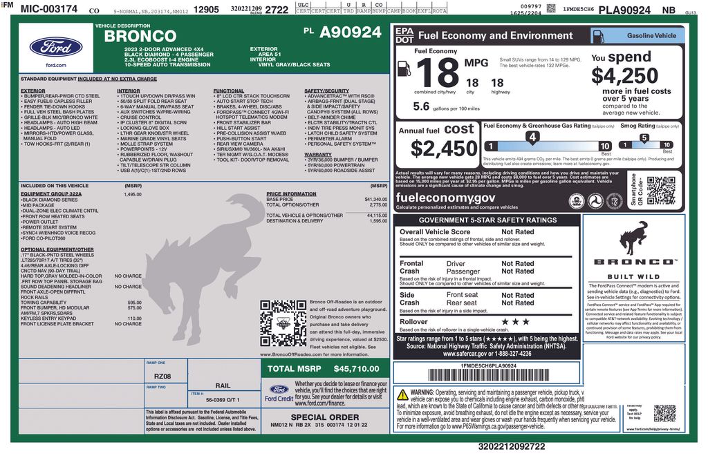 This Bronco's striking Blue exterior is complemented by the durable Marine Grade Vinyl Bucket Seats, creating a bold and adventurous look that is sure to turn heads. With an EPA-estimated 18 MPG in the city and on the highway, you can explore the great outdoors without sacrificing fuel efficiency.