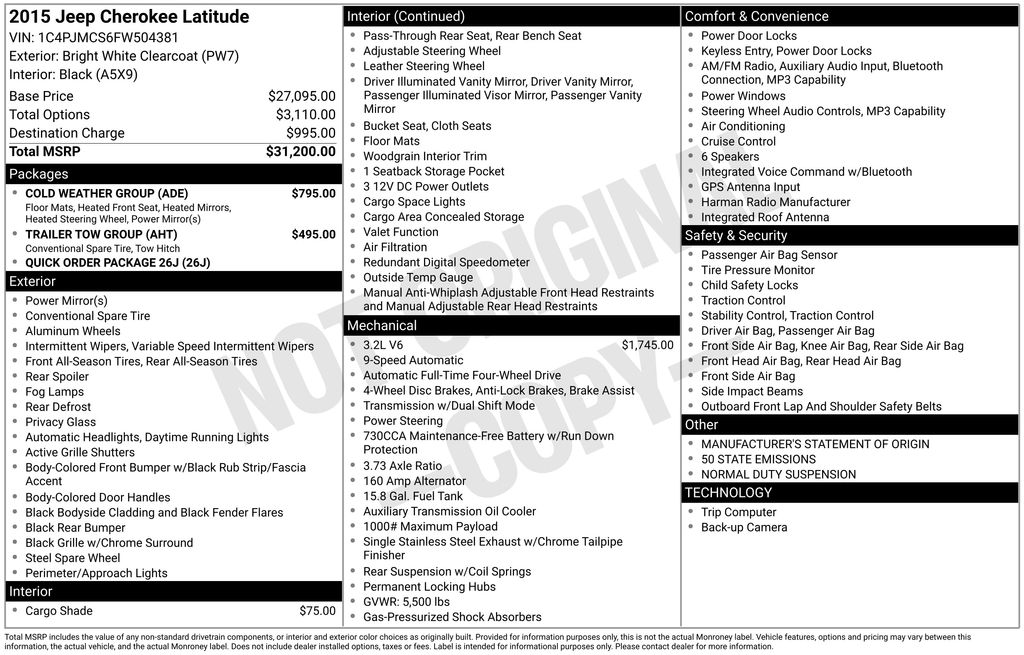 Discover the versatility and capability of this 2015 Jeep Cherokee Latitude. With its impressive 3.2L V6 engine, 9-speed automatic transmission, and 4-wheel drive, this SUV is ready to handle any adventure. Boasting an EPA-estimated 20 city/28 highway MPG, it offers the perfect balance of power and efficiency.